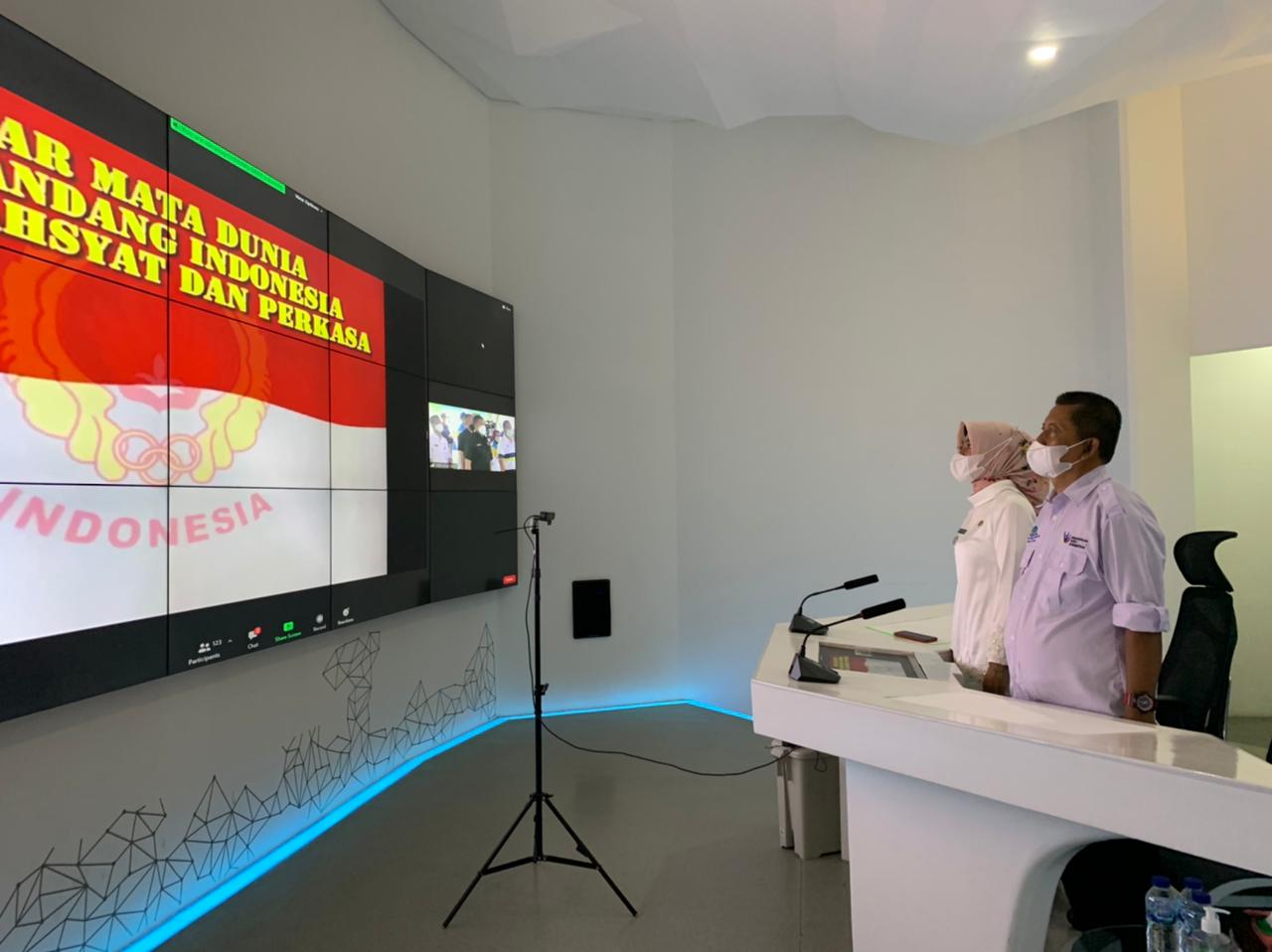 Tampak hadir secara virtual, Wakil Bupati Cirebon, Hj. Wahyu Tjiptaningsih, SE, M.Si, Asisten Pemerintahan, Asdullah Anwar di Command Center Kantor Setda Kabupaten Cirebon.